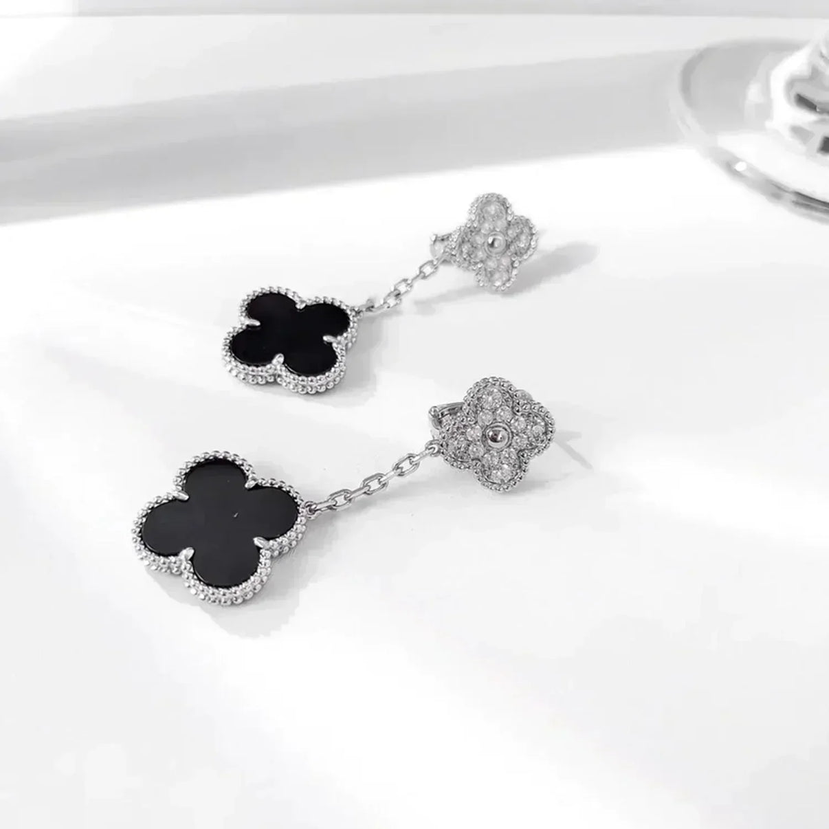 [LUCKY LOVE]CLOVER 2 MOTIFS  DIAMOND ONYX EARRINGS SILVER