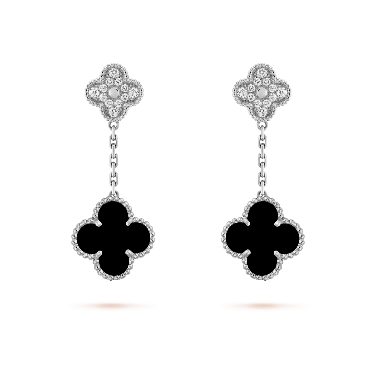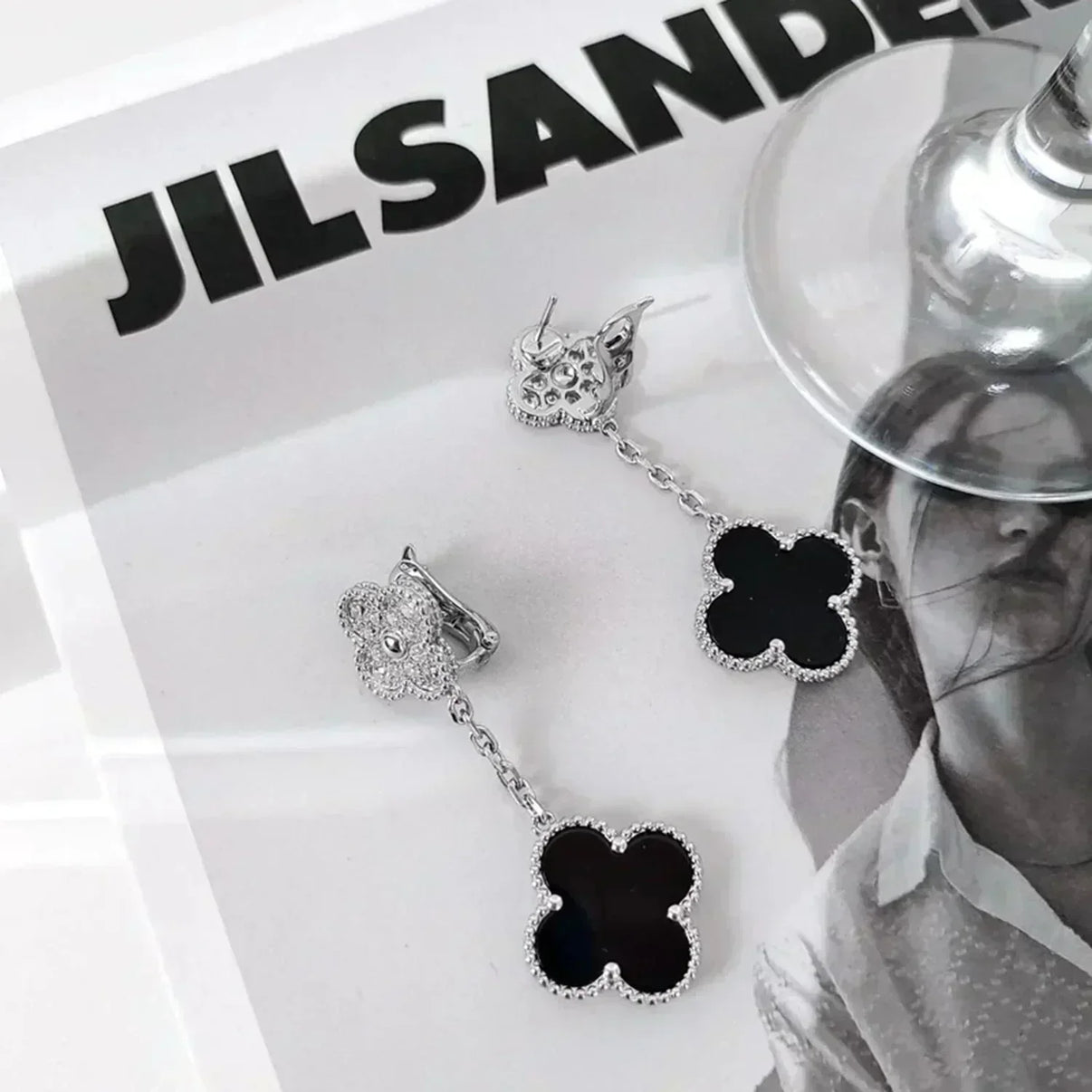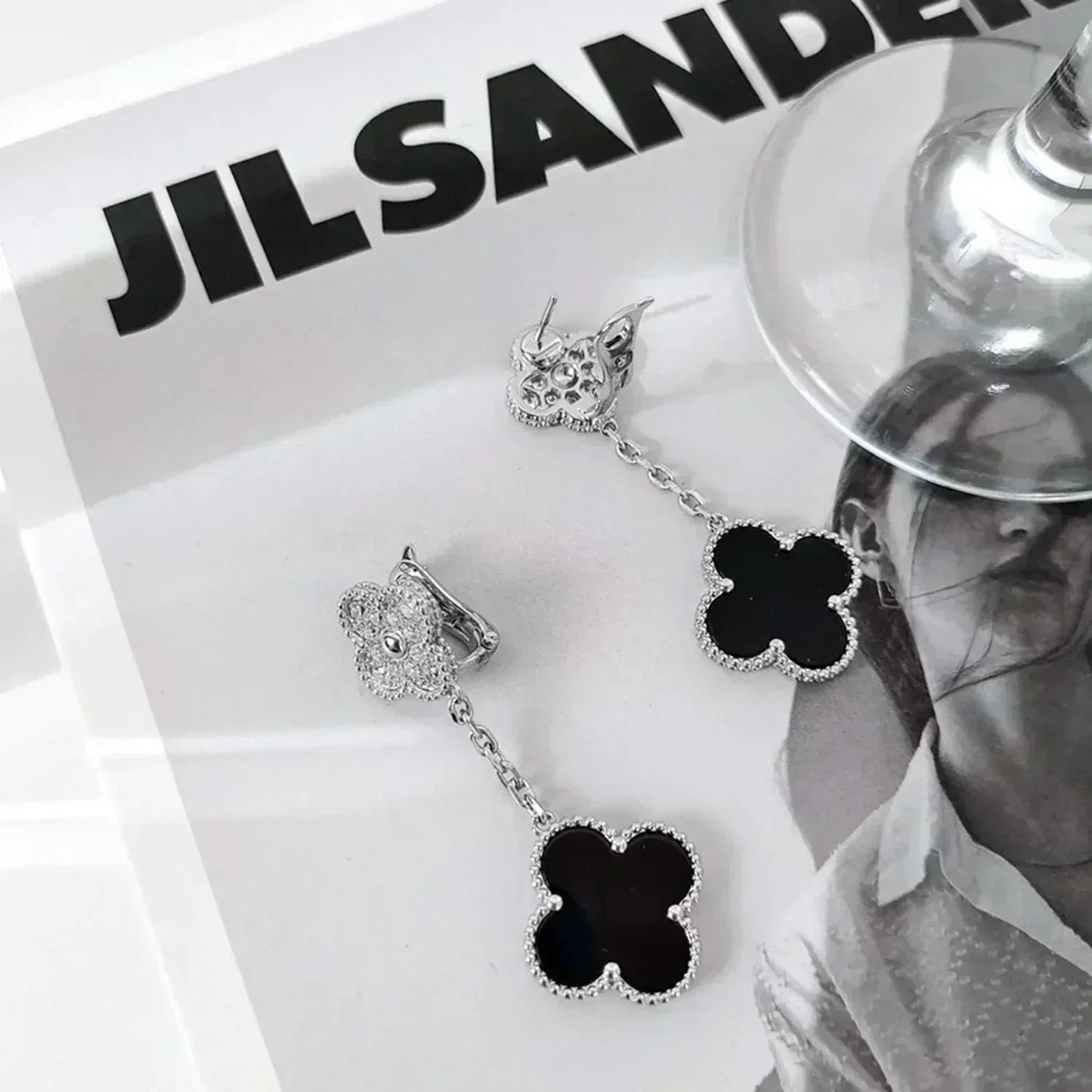 [LUCKY LOVE]CLOVER 2 MOTIFS DIAMOND ONYX EARRINGS SILVER