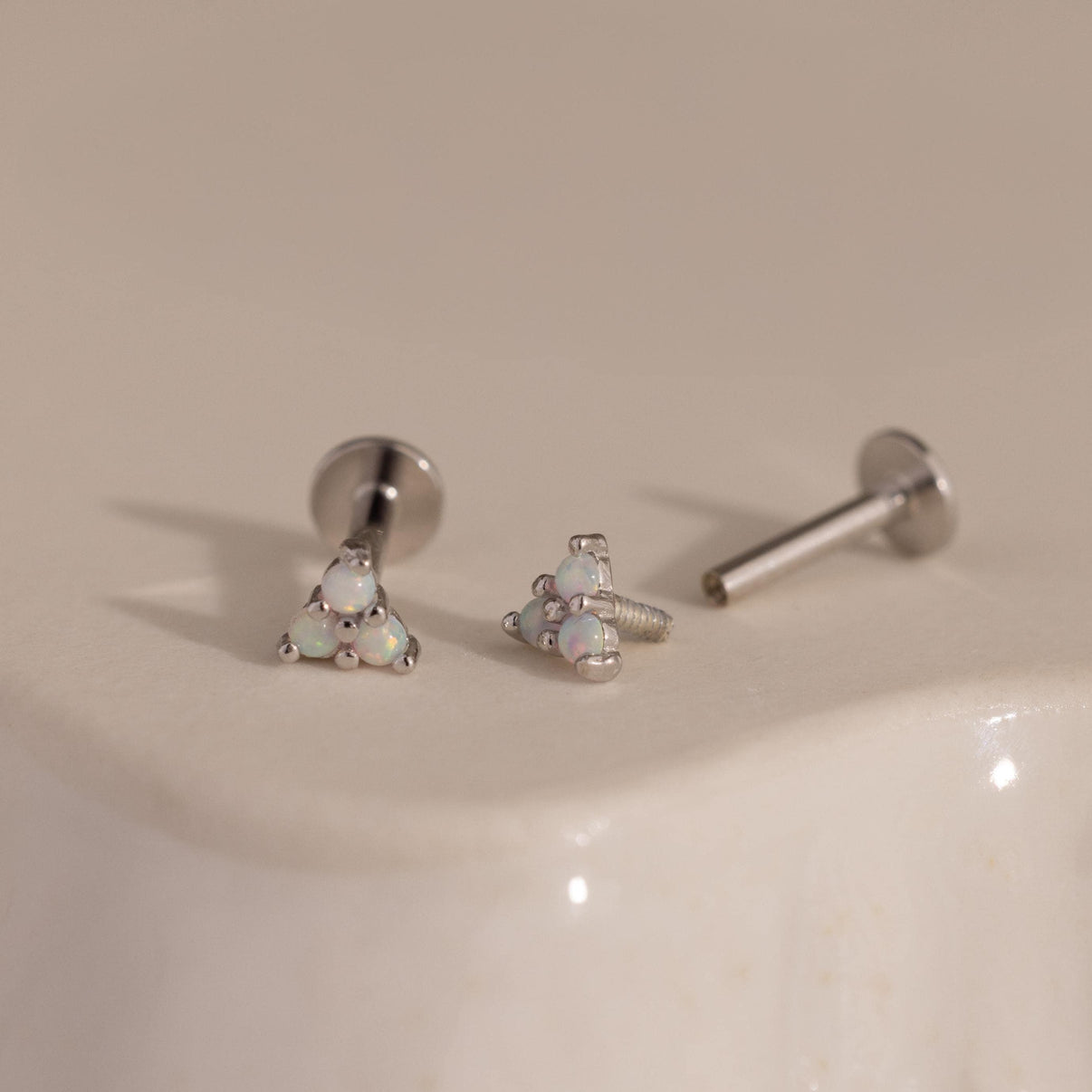 Delicate with a dreamy glow, our Opal Cluster Flatback Studs feature a trio of iridescent opals in a petite pyramid setting. Lightweight and flatbacked for everyday comfort, they add the perfect touch of shimmer to your ear stack._
