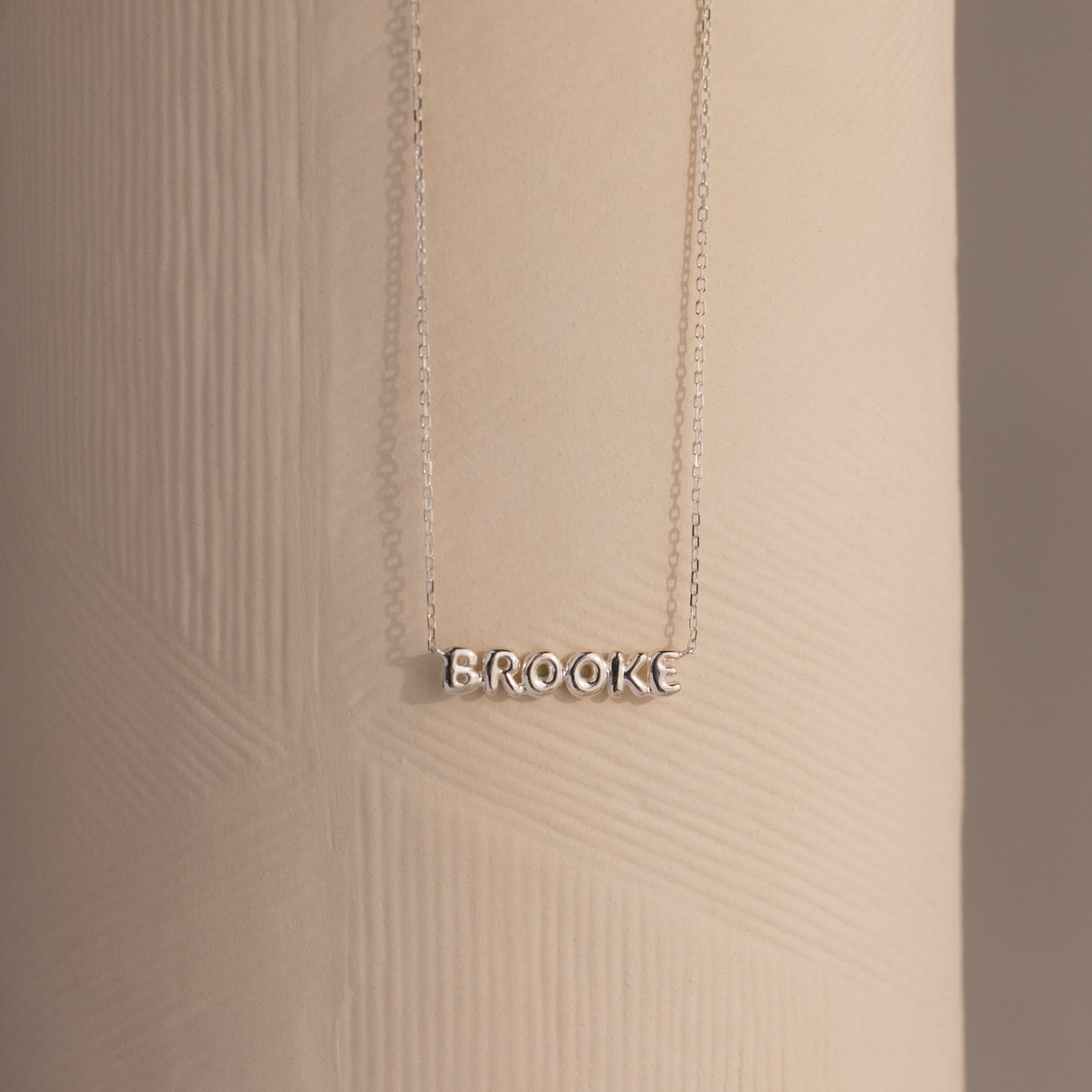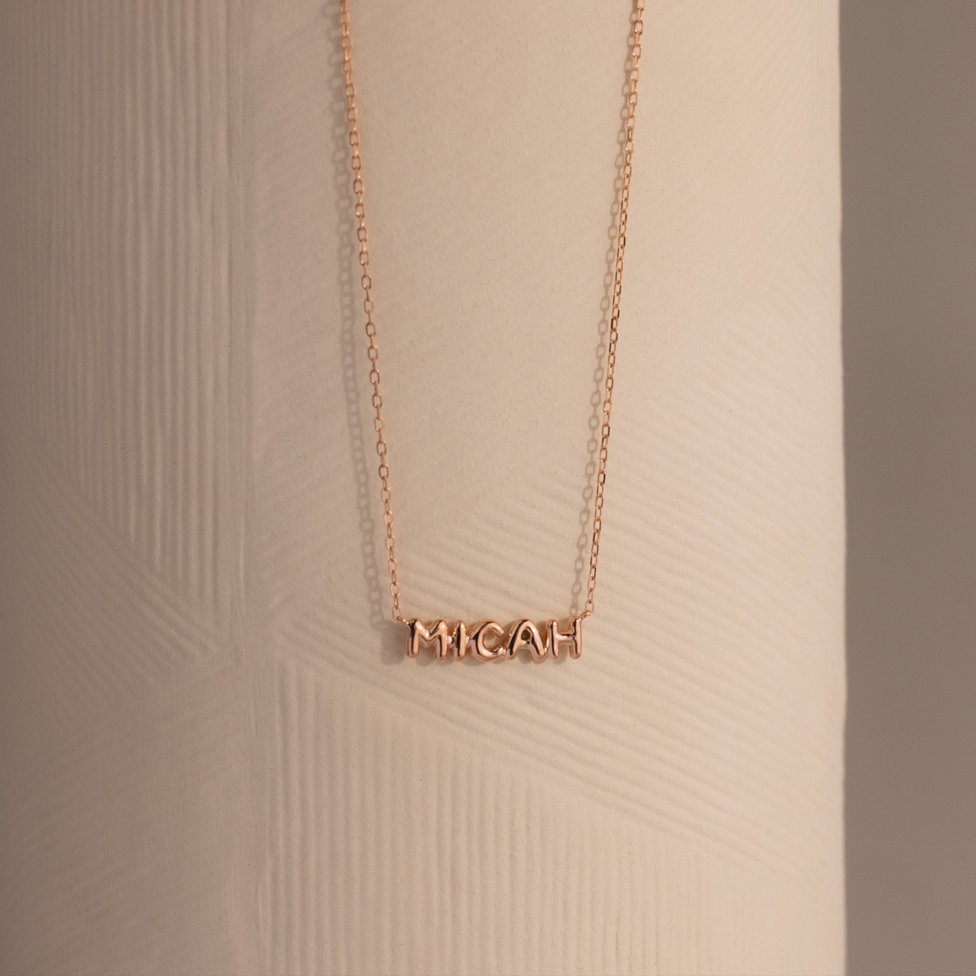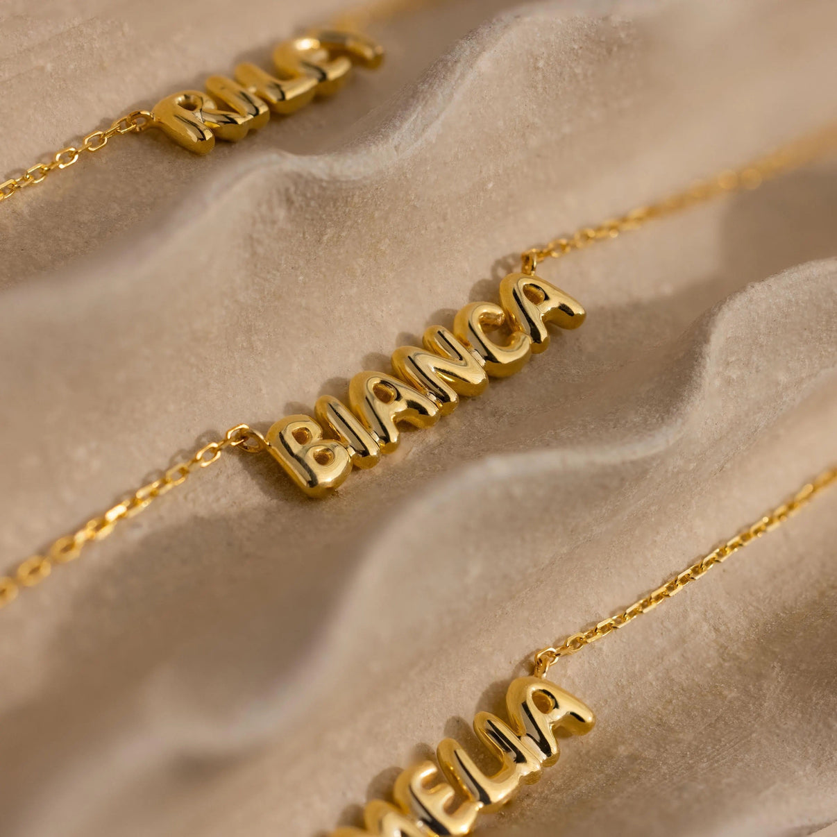 Your name, your way, because personal style should feel personal. Our Tiny Bubble Name Necklace features your custom name or word in a playful, softly rounded script that__ equal parts sweet and stylish. Whether it's your name, a loved one__, or a meaningful word, this piece adds a dreamy, custom touch to your everyday stack.